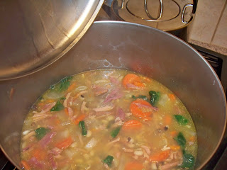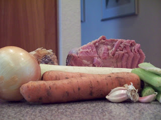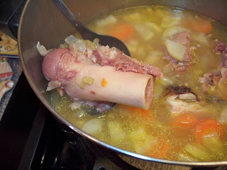 Place the ham bone in a large stock pot and cover it with chicken broth/stock. Add the bay leaves, garlic, chopped carrots, onions, celery and turnip (insert-your-own-root-veggies-here). Simmer on low heat for 2-3 hours, until the ham is falling off the bone and the marrow slides out easily.