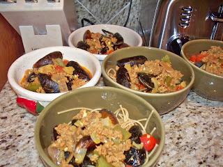 You have two options about the noodles. You can drain them and add them to the pot now, giving a healthy stir so as to mix well. Or you can dish the noodles into bowls and pour the stew over top. Whichever you prefer!
