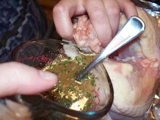 Combine all other ingredients (except the onion and whole garlic pieces).  Rub the mixture into the chicken by pouring it into the space you’ve created between the skin and the bird. Use all of the mixture and alternate between pouring the mixture into the crevasses and using your fingers to rub the mixture in and around to ensure as much of the chicken directly under the skin is coated.