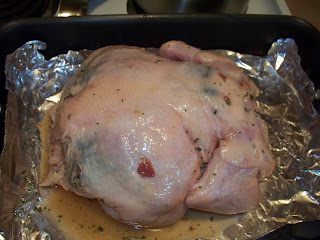 Place the onion and garlic pieces inside the cavity of the chicken. Arrange the chicken breast-side up on a foil-lined roasting pan.
