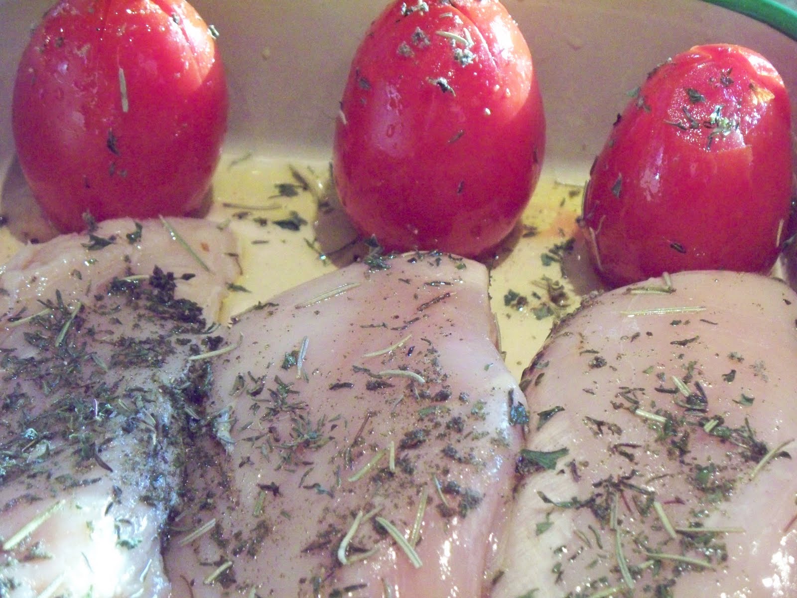 Core the tomatoes and cut a small X in the bottom of each tomato. Place the tomatoes and the chicken in an oven-safe dish and coat with the olive oil. Season tomatoes and chicken breasts with the spices. Cover the dish with aluminum foil and roast in the oven at 350 degrees for 45 minutes.