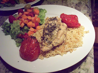 Serve each piece of chicken over the brown rice with two roasted tomatoes. Remove the tomato skin if desired.