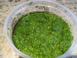 I then scraped that into a tupperware and did a quick n’ dirty rinse of the food processor before I started over again with the cilantro. Now I got a little creative and beyond adding the lemon, garlic, and olive oil, I also add in a little cumin and some dried chili powder. No one said pesto couldn’t have a little kick to it…