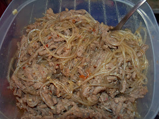 In a bowl, combine the cilantro, soy, chili paste, and oil. Add the noodles and meat to the mixture and toss well to completely coat.