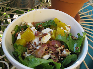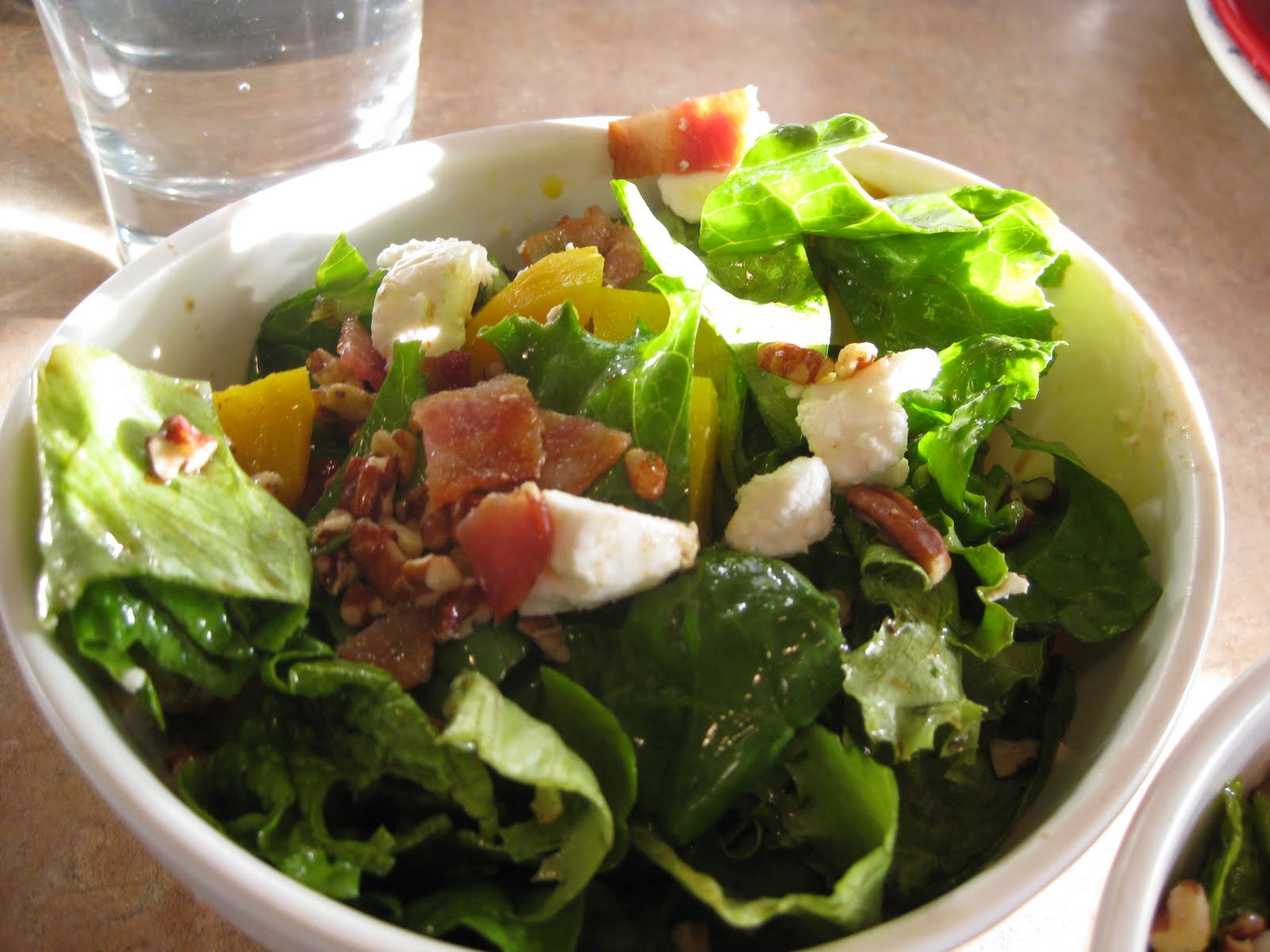 In a small bowl, mix the olive oil, vinegar, and 2 TBSP of the bacon drippings. Season the dressing to taste with salt and pepper. Toss the dressing with mixed greens in large bowl. Erin F. warns, “You may not use all of the dressing, so add it slowly.” This is great advice and a way to make sure the salad stays on the healthy side of things by not going overboard with dousing on the dressing.