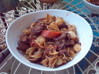 Beef Burgundy (or bouef bourguigon to Julia) is a rich dish of wine soaked beef, carrots, onions, noodles, carrots. Part stew, part pasta, it is an excellent cure for the winter blahs or to warm cold bones. It makes enough for a feast to feed a large crew or to freeze portions for later.