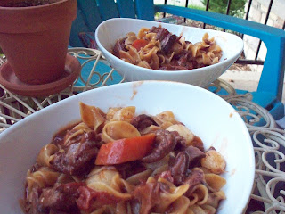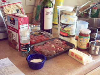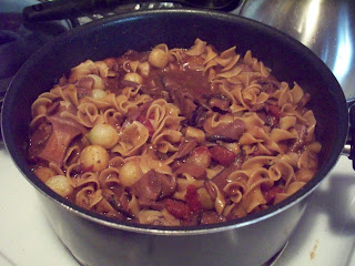 After one hour, add the pearl onions and egg noodles. Pour in enough beef broth to cover the noodles and stir all to combine. Cover and simmer on medium heat for 20 more minutes. Remove the cover and, if necessary, boil to the consistency of sauce you desire (though the noodles should soak up most of the added broth). Season with salt and pepper and serve.
