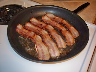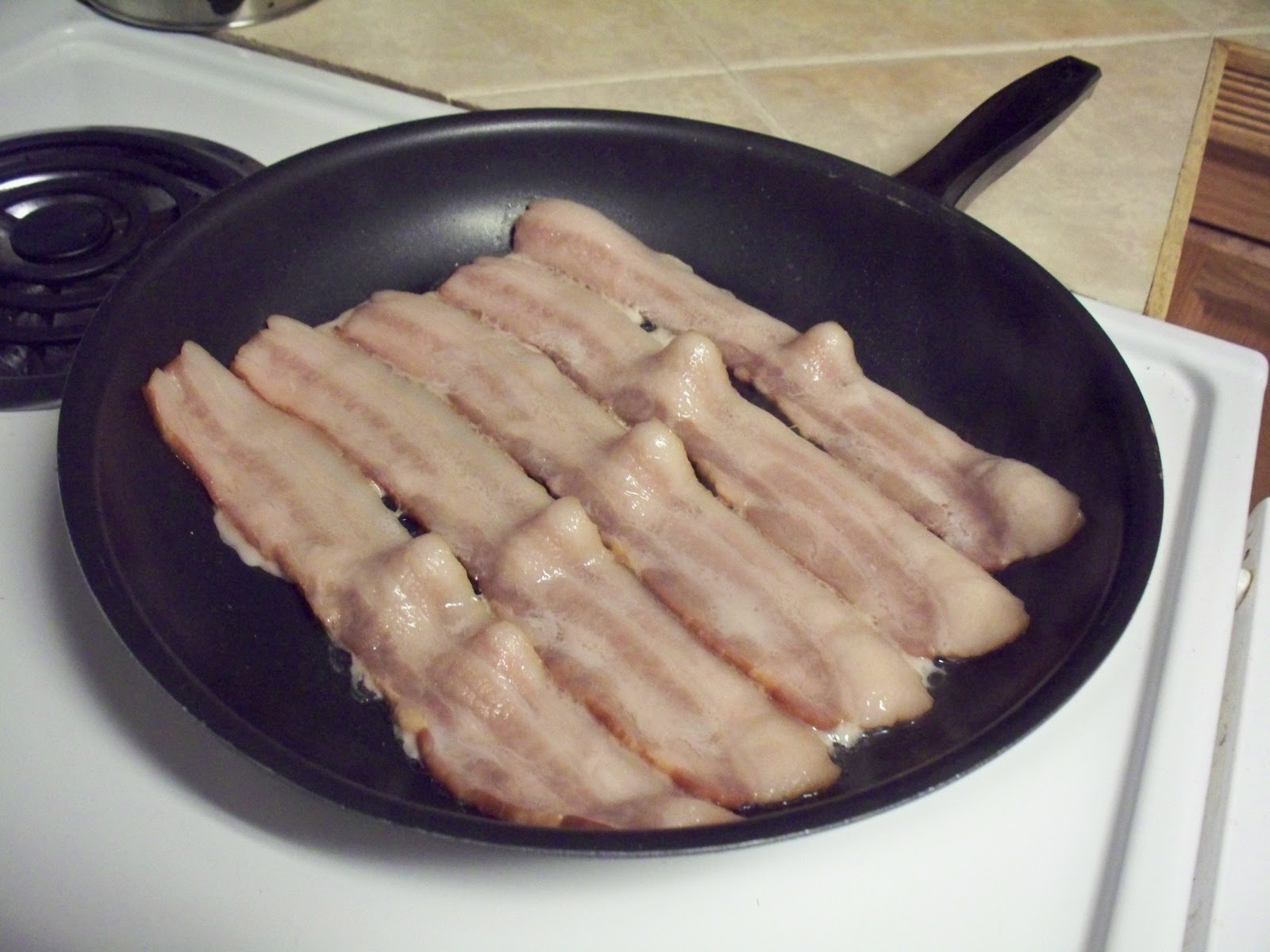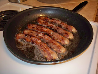 In a large skillet with deep sides, lay out 5-6 pieces of the meat candy. Turn the stove temperature to medium and start cookin’!