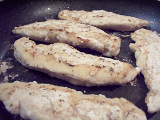 While the mushrooms and pasta cook, dredge the chicken alternately in the egg and flour until evenly coated. In a cooking spray-coated medium skillet on medium to medium-high heat, cook the chicken tenders for 4-5 minutes on each side. Add 1/2 cup of the wine and 1 cup of the chicken broth and allow the sauce to boil and reduce. Set the chicken aside and pour any remaining sauce over the top of the chicken.